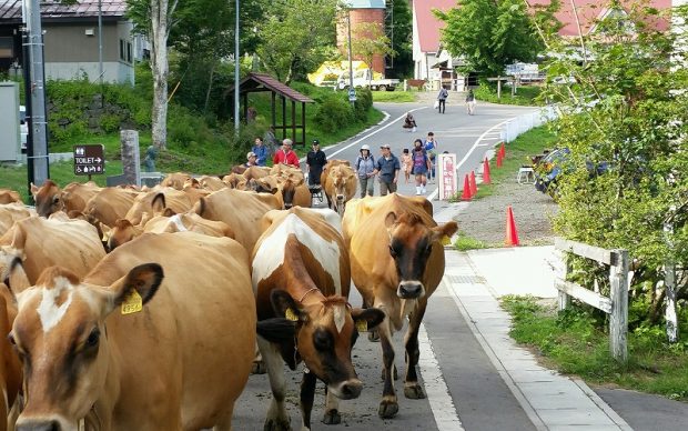 神津牧場の約70頭のジャージー牛の行進の様子、春から秋の放牧期には60ヶ所ほどある牧草地を転牧しながら計1万キロを移動すること、そして濃厚なミルクとそれを用いた芳醇なソフトクリーム、チーズやバターが紹介されました。